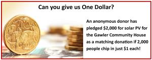 One of Tansition Gawlers recent projects has been to connect CORENA (Citizens Own Renewable Energy Network Australia) who were looking for small scale projects (they have already completed one), the Gawler Community House, who wanted to install solar power to reduce their costs, but didn’t have the funds to be able to do so on their own, and a local (small scale) company, Down to Earth Sustainable Solutions, who are doing energy audits and designing the Solar PV system they require. The result is that it was picked as CORENA’s second “quick win” project!!!!!!