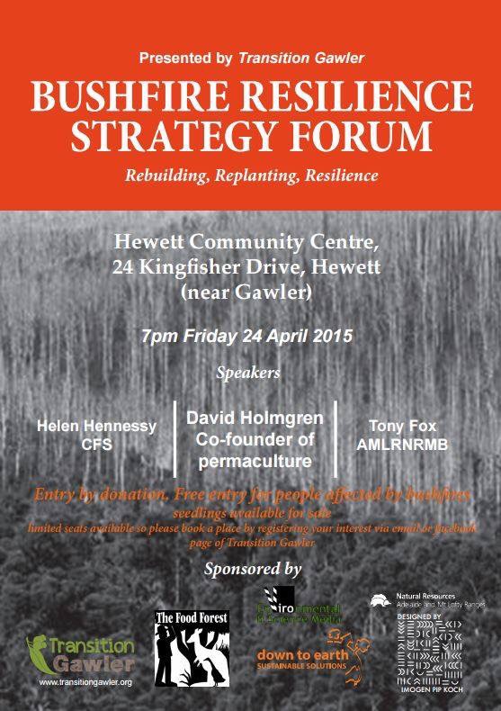 Prompted by the Sampson Flat fires which occurred in January 2015, and resulted in a number of houses being destroyed, and 12,500 hectares (31,000 acres) of land being burnt, including forest and grazing land, Transition Gawler initiated a Bush Fire Resilience Strategy Forum which was held on 24 April 2015 at the Hewett Community Centre.