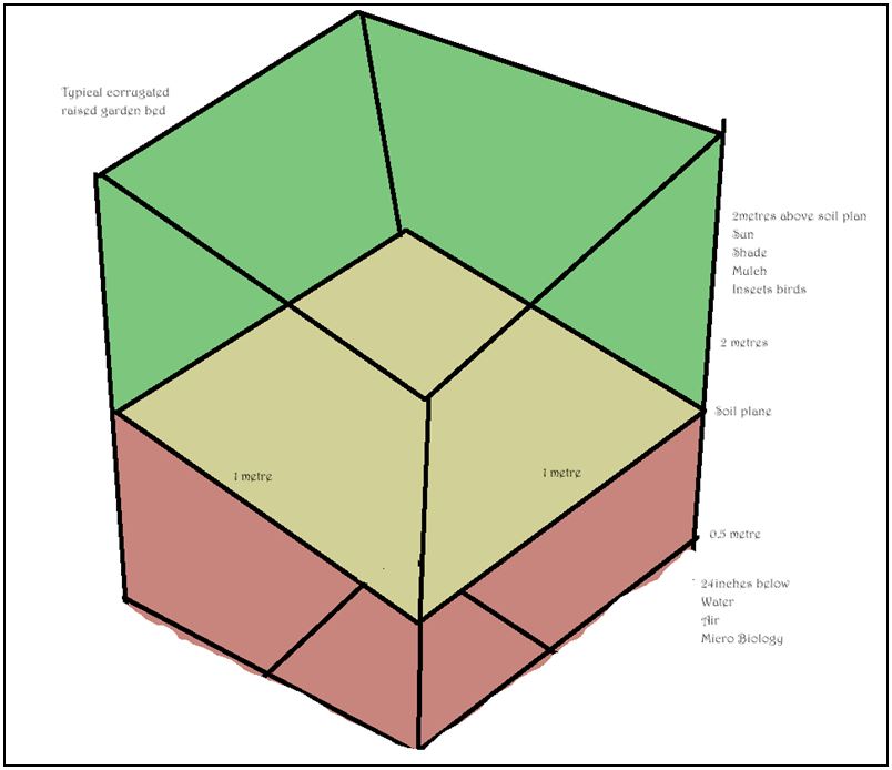 However, thinking in the 3rd dimension our Magic Square suddenly transforms into a ‘Magic Rectangular Box’. Below the soil plane a good 0.5m that can be filled with roots and tubers, and above the soil plane up to 2 metres of growing space (you will be surprised how tall peas and beans can grow if given the room). All in all, 2.5 times bigger.