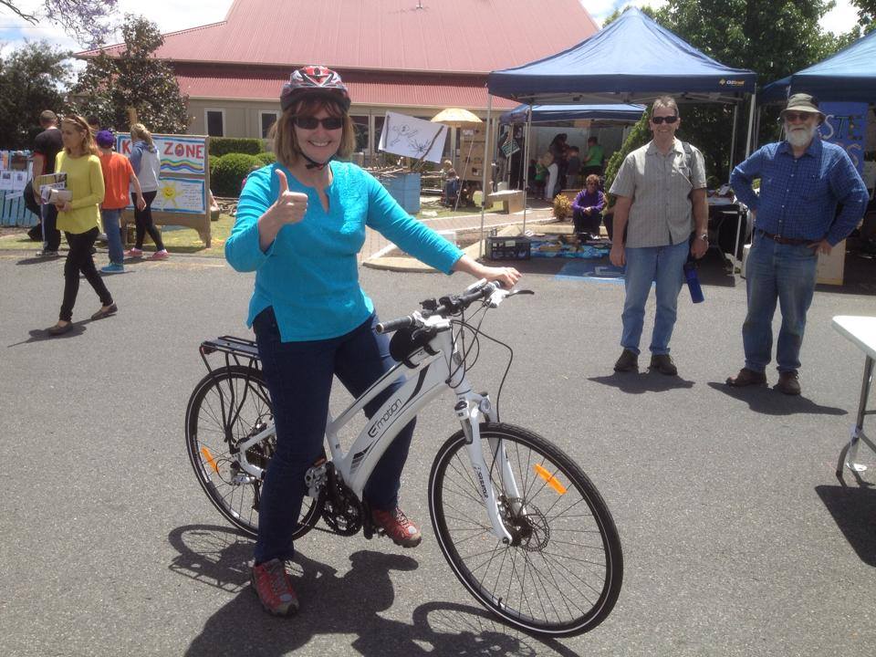Karen Redman gives the e-bikes a thumbs up after taking it for a test ride at the Sustainable Living Festival